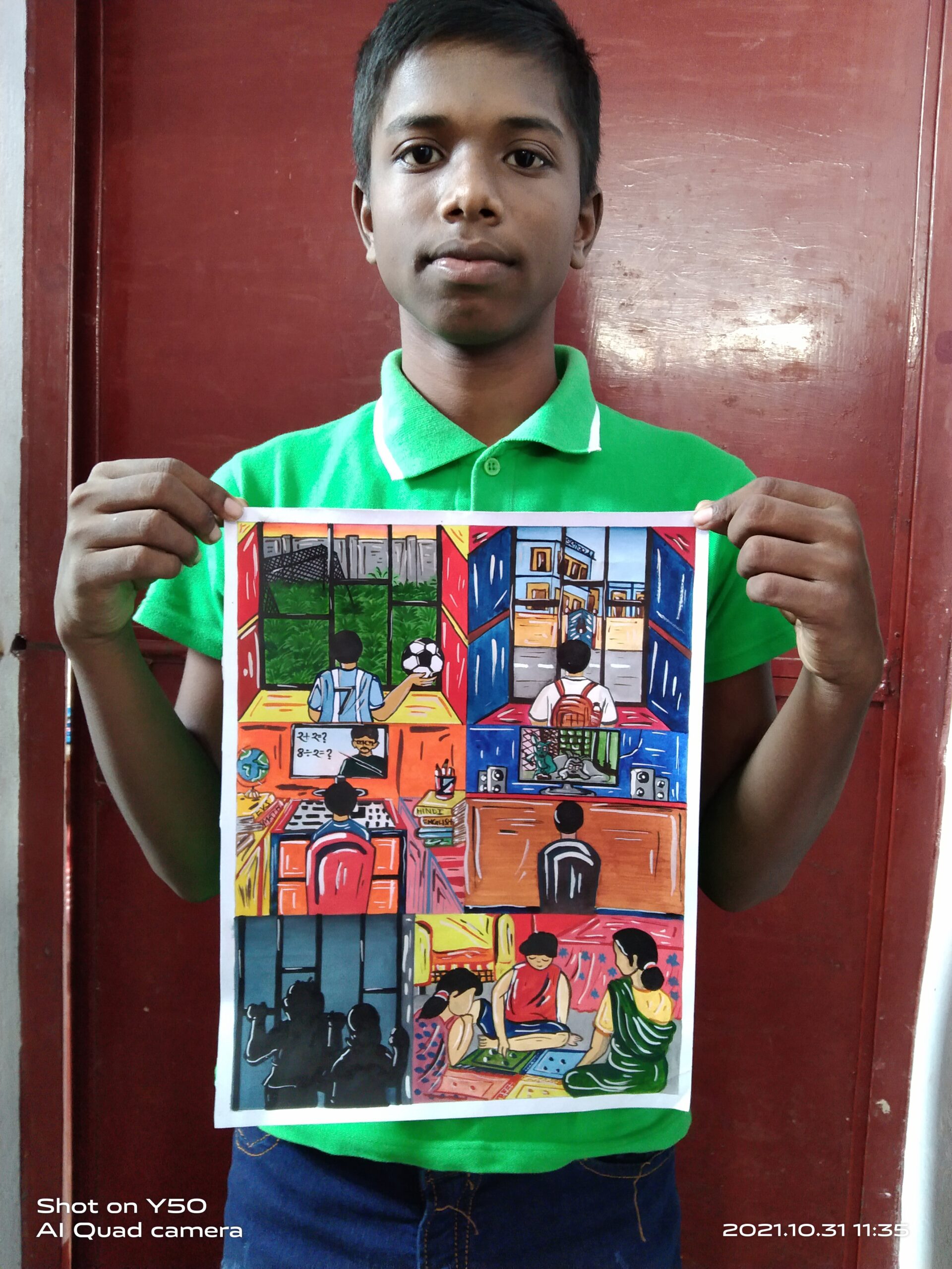Judge's comment: Though there was only one more contestant in this category we did not consider the artwork because it is not within the topic and others who have submitted late are not considered, resulting in uncontested win, but undoubtedly this drawing is Amazing! He has shown how students from online school can spend time with family and also play indoor games or outdoor games at home. They don't have to go to school, they can learn everything at the comfort of their home.
